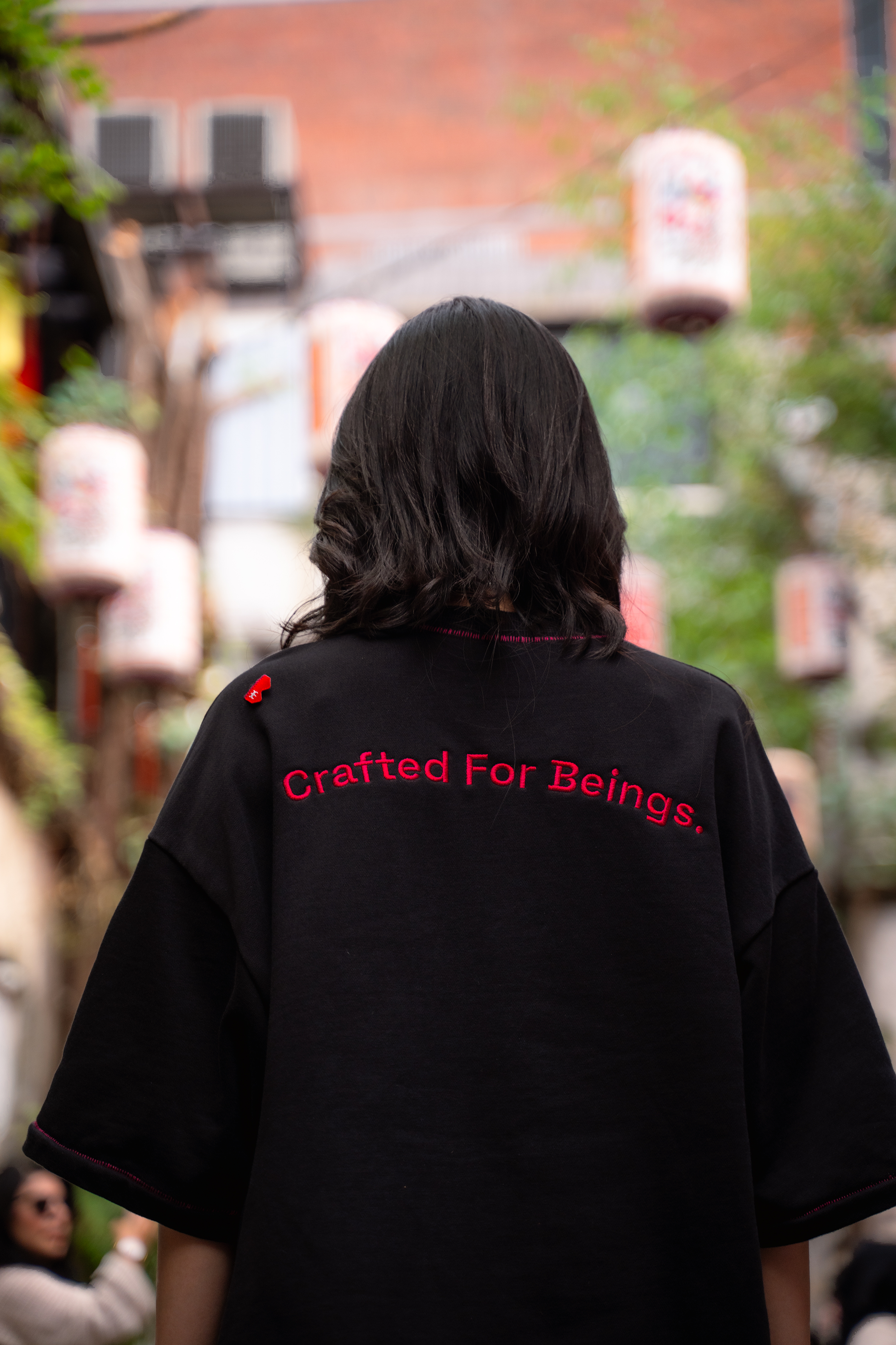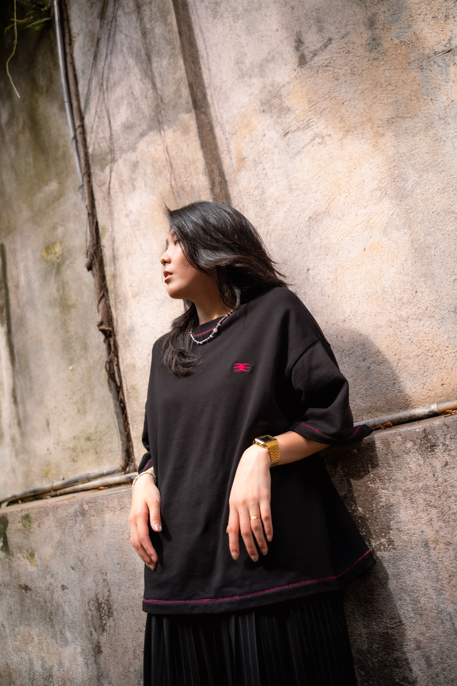 An oversized half-sleeve tee – featuring a front & back embroidery, flying sewn ribcage tag and red stitching by the hem, sleeves, and collar.